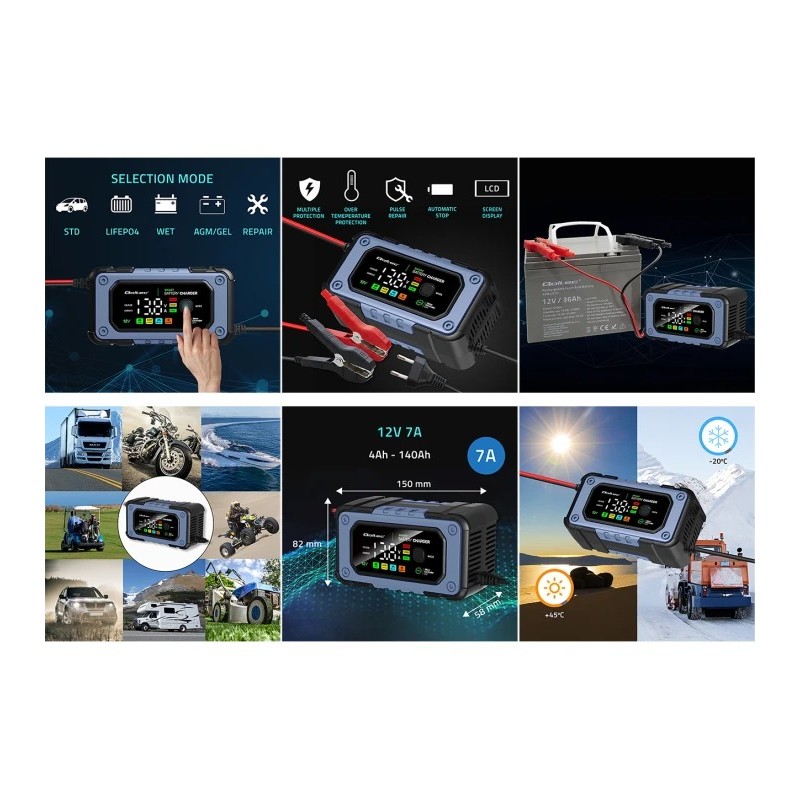 Έξυπνος εξελιγμένος φορτιστής-συντηρητής μπαταριών, ελεγχόμενος από μικροεπεξεργαστή, για 12Volt μπαταρίες με οθόνη LED. Τεχνολογία 3 σταδίων φόρτισης με έλεγχο σταθερού ρεύματος και σταθερής τάσης. Σχεδιασμένοι ώστε να φορτίζουν με τον πιο σωστό τρόπο, πλήθος μπαταριών, εξασφαλίζοντας τη σωστή τους απόδοση, επιμηκύνοντας το χρόνο ζωής τους, διατηρώντας τα χαρακτηριστικά τους. Συμβατοί με όλους τους τύπους μπαταριών οξέος μολύβδου, AGM, GEL, SLA και WET, που χρησιμοποιούνται σε διάφορα οχήματα, όπως αυτοκίνητα, μοτοσικλέτες, φορτηγά, τροχόσπιτα και σκάφη